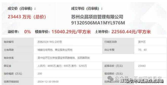 东吴序售楼处营销中心:400-8828-814东吴序售楼处电话/地址☎:400-882-8814(开发商热线)今年1月土拍中,苏州众昌项目管理(吴中建设)底价拿下该地块,成交总价2.3亿,成交楼面价15040元/㎡。