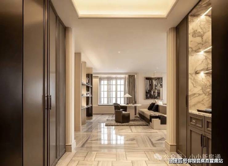 进入室内的入户玄关收纳空间,地面采用静雅棕、宝格丽兰石材拼花设计,古典回形波打+实心铜条的搭配增强入户尊贵感。右侧是山水白奢石的开放格,左侧是行李间,通过暗门的做法,将功能结合进去,强化了归家的仪式感。