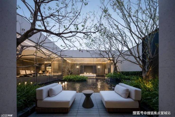 苏州万科璞拾胥江华庭售楼处电话地址咨询:400-8558-334【营销中心热线】第三个庭院,游园视线聚焦在这四方天井之中,结合大面积玻璃幕墙,让建筑与自然的界限消解,创造出度假的静谧氛围。