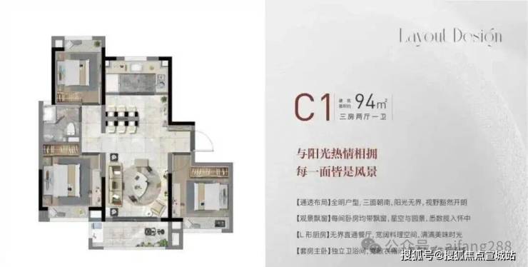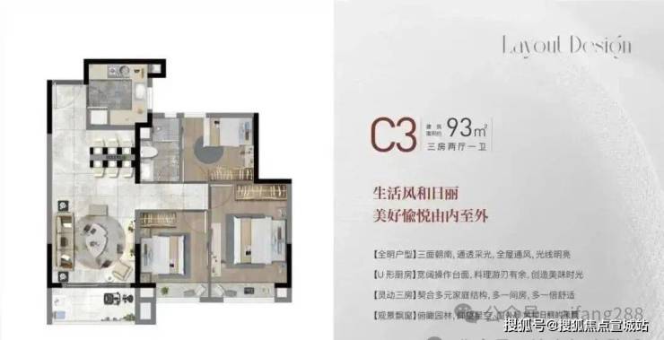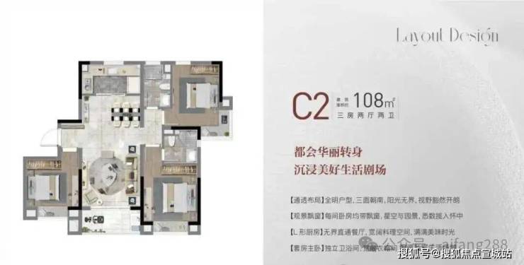 建面约108㎡3房2厅2卫,做到了三开间朝南+双阳台设计+主卧套房设计+南北通透,该户型得房率非常高。
