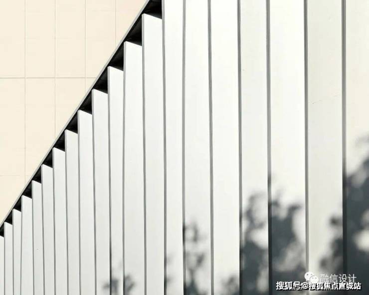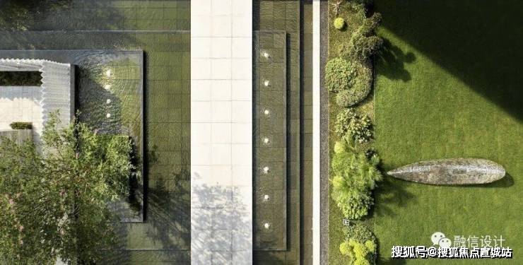 水波和光线,纯净的墙体,干净利落的线型交错,树影中的金色线条……以现代主义建筑表达方式使不同材质之间链接,作为对场地的自然人文环境的关照,延伸场所中抽象的时间感,回望城市的荣光。