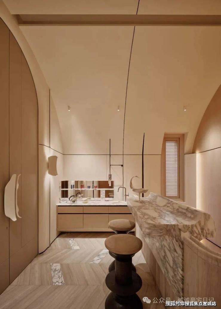 顶层专属于主卧,推开双开门,拱形天花设计尽显浪漫,挑高至3.8米,一条长灯带自浴室贯穿至整个卧房,分置于灯带两侧的弧形结构,环抱出一份安心。而其床头背板也被设计成拥抱的视效,为空间增添温暖包裹的氛围。