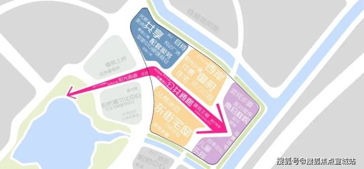 一条连续的公共通廊由海天湖公园引入社区,贯穿三大功能结构区。