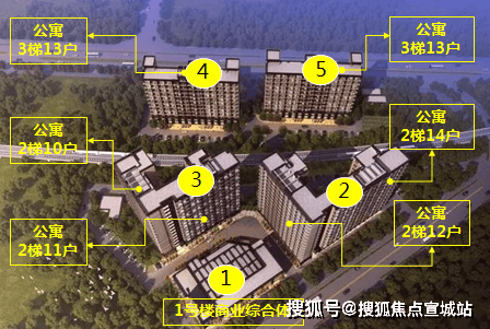 规划共5栋楼,1号楼为商业综合体,2-5号楼为酒店式公寓。2、3号楼总高16层,2号楼东南面为2梯14户,西南面为2梯12户,3号楼东南面2梯11户,西南面2梯10户;4、5号楼总高12层,设计为3梯13户,共计1069户。