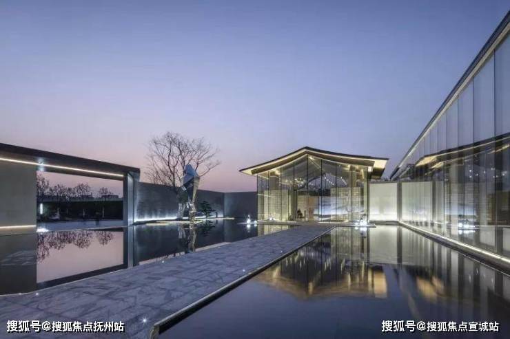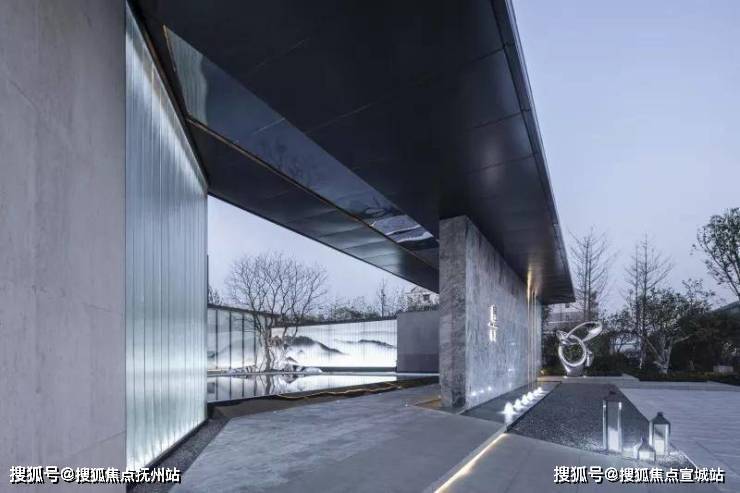 穿过大型玻璃构筑,走进前场。门楼前开阔的广场,昭示了元垄·华著“现代化、城市化”高端楼盘的定位。穿过西周直江上的景桥,即可看见景观水帘,水流淅淅沥沥地流淌,灵动悦耳,与简约的门楼相互映衬。踏上台阶,超大水面映入眼帘,水中倒映着简约现代、充满绍兴特色的销售中心建筑。