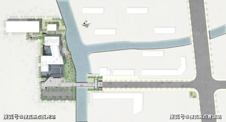 示范区后场面对水质良好的西周直江,设计团队打造了滨河景观带。沿建筑玻璃立面处设计的平台空间可用作室外洽谈区。景观设计采用现代市政手法,树阵广场结合草坪,局部种植花卉。人们于沿河外挑木平台上休憩,可观看沿河风光。草坪、花田、滨河景观打造出“花梗渔唱”之景。