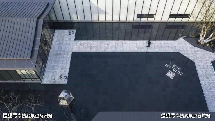 镜面水景倒映着建筑的倩影,水面与建筑融为一体。人们踱步经过,从水景侧边的镜面不锈钢中,不断看见自己的身影,趣味十足。黑色的池底,仿若一方墨池,呼应绍兴后马八景之一的“趣园墨池”。景观雕塑仿照绍兴柯岩云骨之形,静于水面,正气凛然。