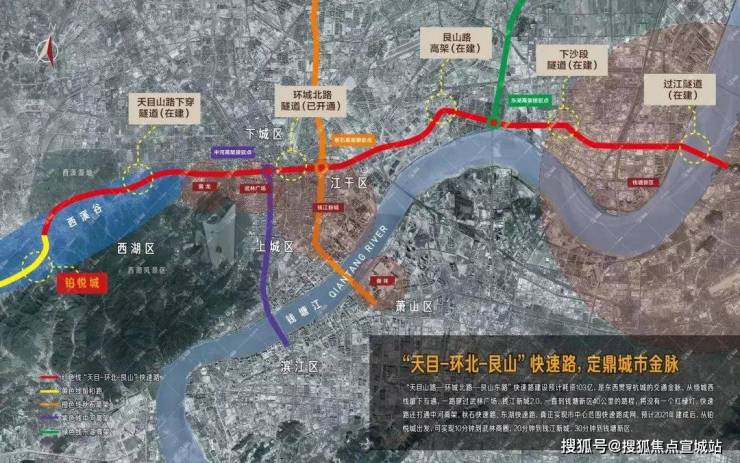 天目-环北-艮山快速路,2022年5月底天目山路段先贯通,基本无红绿灯,从项目出发可实现20分钟到武林商圈,30分钟到钱江新城,45分钟到钱塘新区(环北-艮山路段在建中,通畅时45分钟到大江东)纵贯东西。