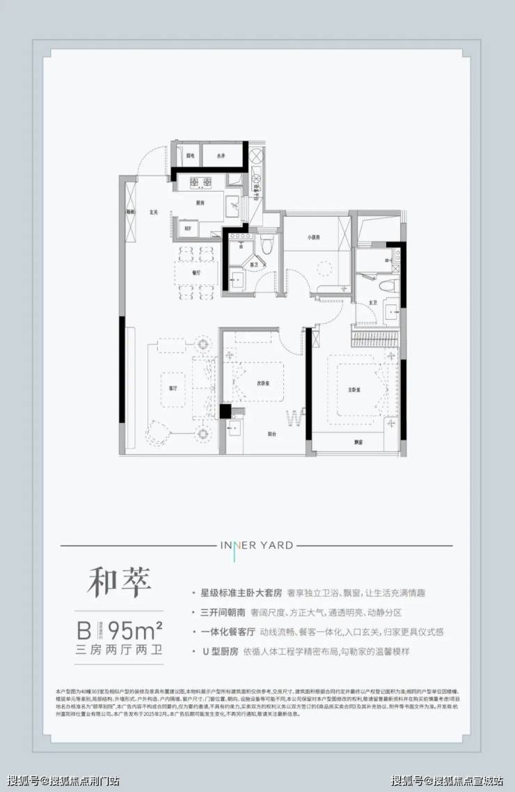 建面约95㎡三室两厅两卫的中间套,三开间朝南,总面宽接近9.8米,餐客厅一体化设计提高了空间利用率,整个竖厅非常阔绰,属于同面积段户型中的稀有物种.