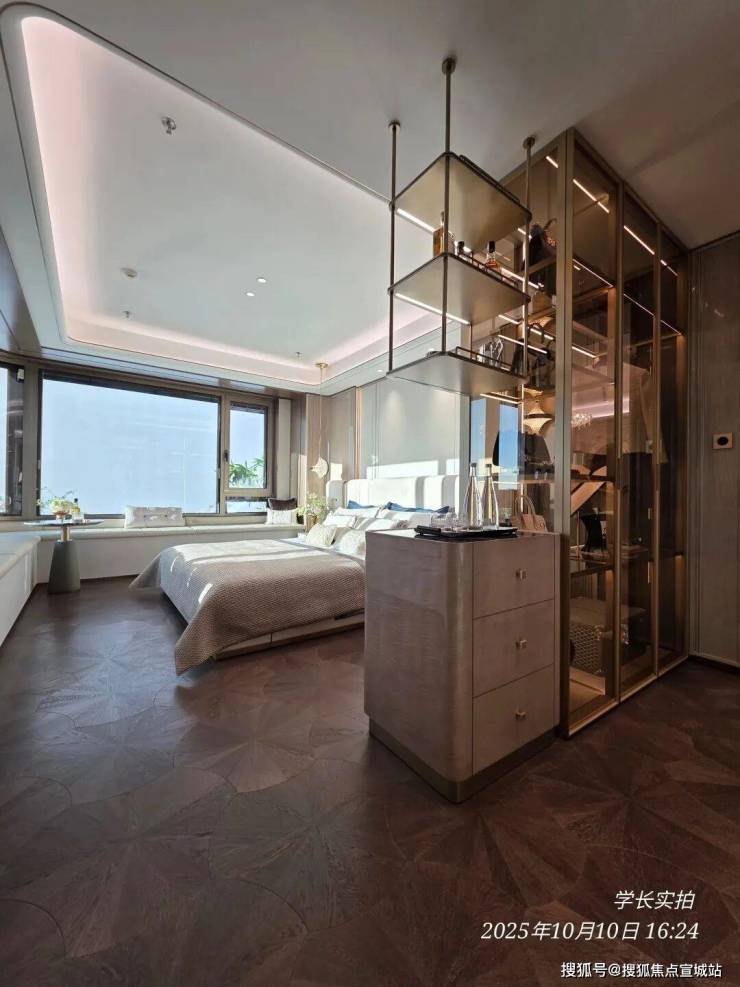 这是125㎡样板间的“女神卫浴”空间,专门利用镜面光、顶光、侧边光墙打造了一个协同光域场,让你站在镜前不会感到传统光源的刺眼,光线均匀柔和洒下,让你在梳妆时每个细节都纤毫毕现。