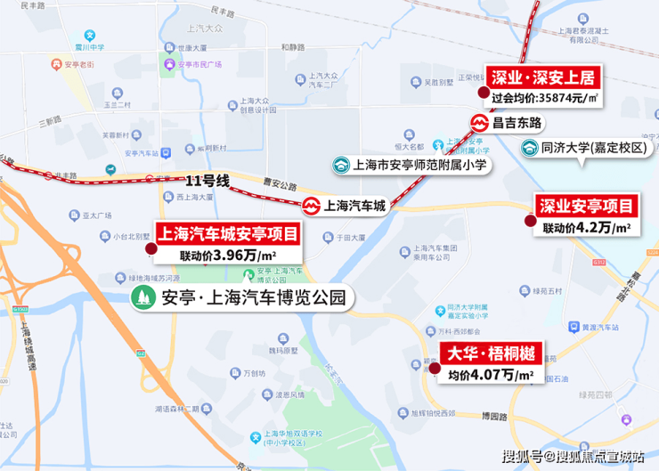 地铁11号线昌吉东路站直线仅约200米,2站可达嘉定新城,9站虹桥火车站,且同区域仅约1公里的深业安亭项目联动价已达4.2万/㎡。