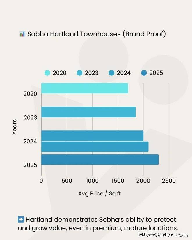 Sobha本身就自带品牌溢价,首霸Hartland联排别墅的价格走势(2020-2025年每平方英尺均价持续攀升),印证了首霸即便在高端成熟区域,也具备资产保值与增值能力。