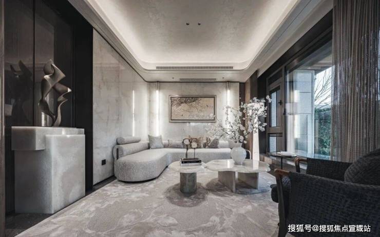 首先是奢石含量极高,从入户处的玲珑玉拼花与透光云石辉映,到翡翠绿奢石墙景、再到 发光云石装饰点亮归家路,石材的典雅贯穿始终。