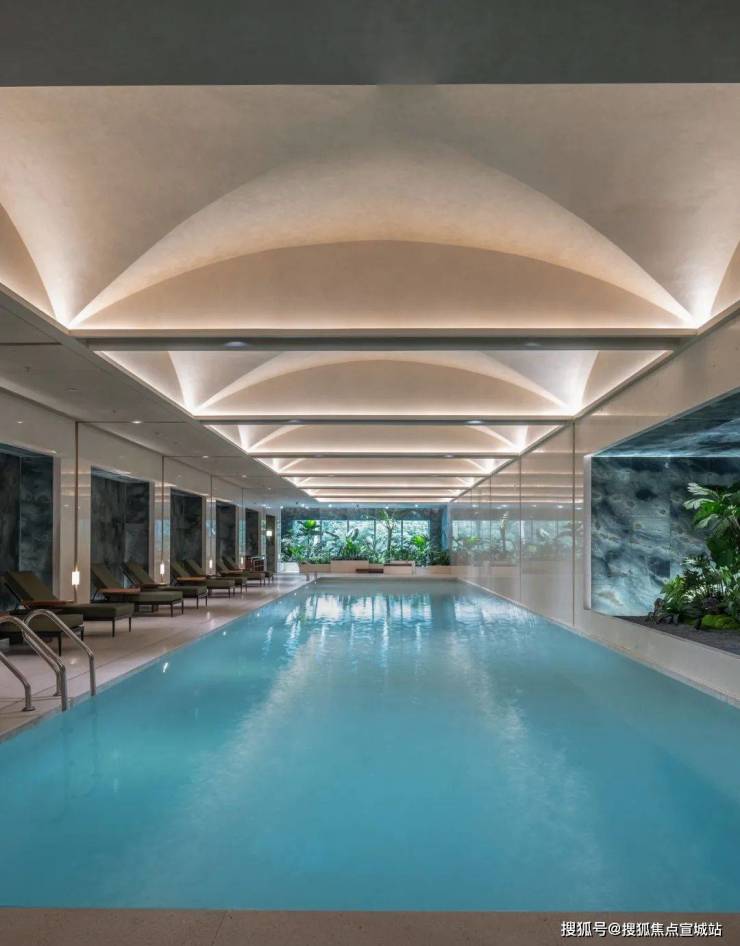 豪宅中,会所+泳池已经成为市场标配。但是万科中興傲舍,真正做到了“把艺术作为生活的一部分”。植物园泳池放在了2楼,选用了皮革面的绿色石材,营造一种树影斑驳的感觉。里面的绿植不是装饰,都是鲜活的、精心照养的。