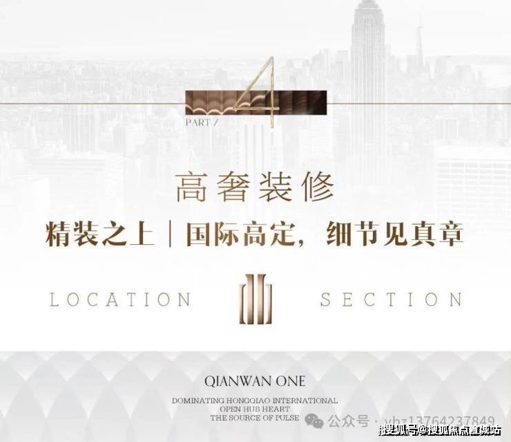 户型细节:顶奢大平层采用一梯一户设计,外立面为干挂石材与玻璃幕墙结合,层高 4 米(装修后 3.2 米),得房率达 80%,户户边套为全明户型且三面采光,部分户型有 270° 环景 LDK 一体化设计,客厅面宽达 8.4 米。