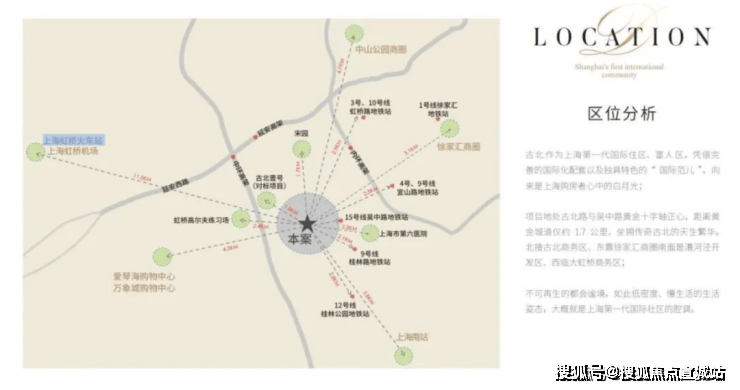 距离虹桥交通枢纽6.5公里左右,出差便利。产业、交通、配套齐聚,且周边就是古北壹号、古北臻园,圈层纯粹!
