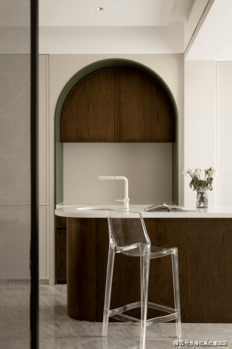 厨餐厅,内置双拱门造型,利用空间穿插、错景,划分餐厅与西厨区,开放互动气质与当代审美相结合,隔而不断,界而未界,留给空间更多的想象和延伸。