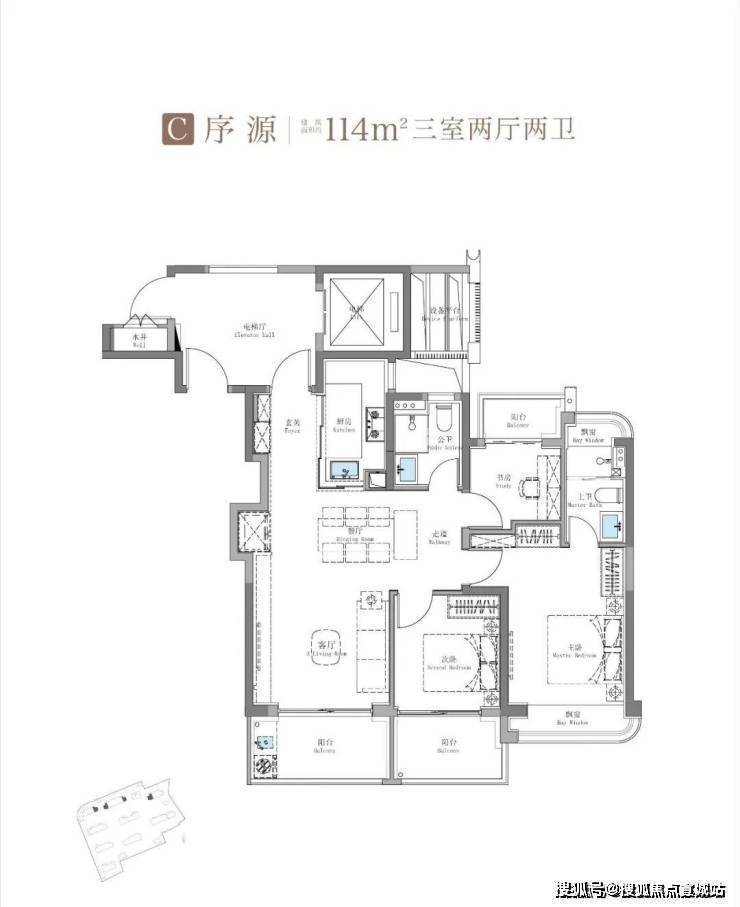 除了建面约100㎡3房外,这个建面约114㎡产品也是主打: