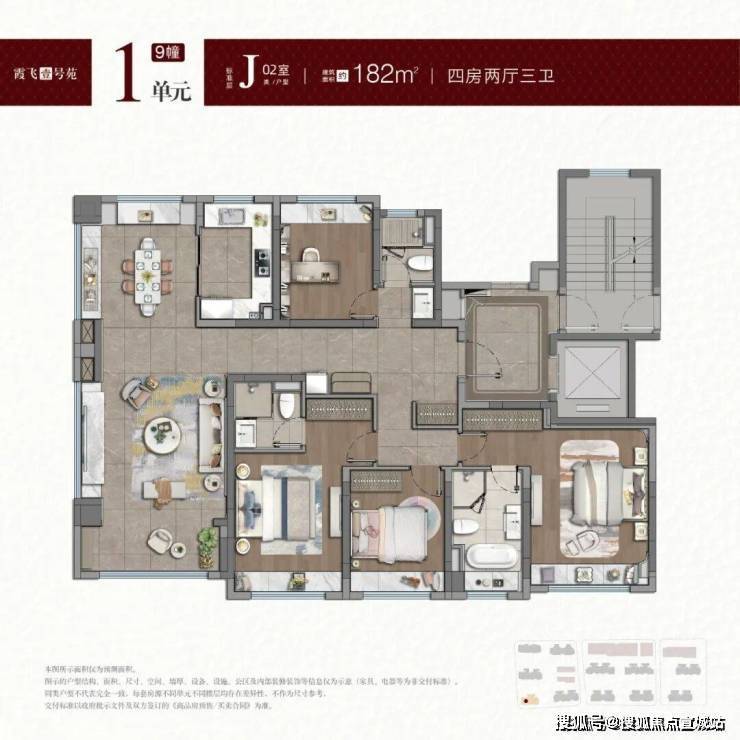 户型与交付标准:户型涵盖建面约98㎡三房至188㎡四房,得房率可达70%-73%,层高3.15米,并配备独立电梯厅、智能家居系统等高端配置;交付标准为精装准现房,强调“私宅级交付”,包括精装社区大堂、入户大堂及地下车库,车位配比达1:1.2。