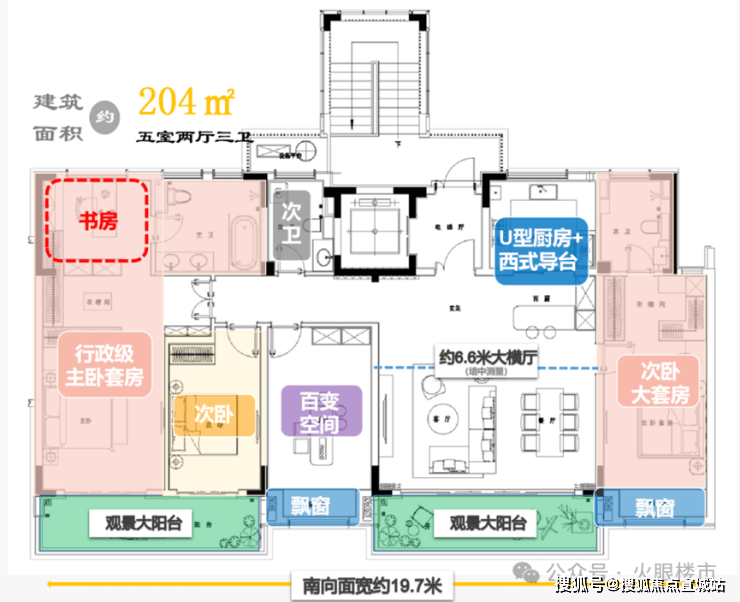 204㎡大平层,以五室两厅三卫布局,成就南向约19.7米、六开间朝南的奢阔尺度。客餐厅、主卧及三次卧全景一字排开,搭配2个约6.6米、270°环幕景观阳台,形成超广角视野。