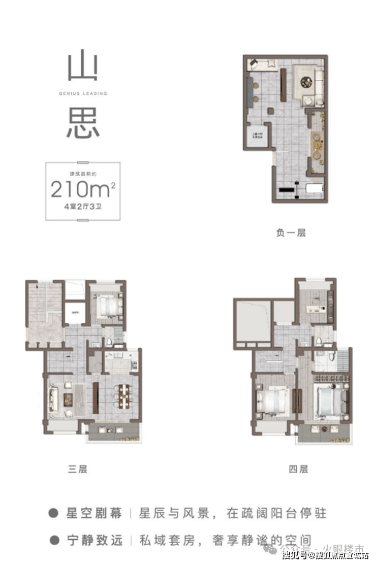 山水叠墅:建面约190-210㎡,4层立体空间,上层览景,下层拥院。