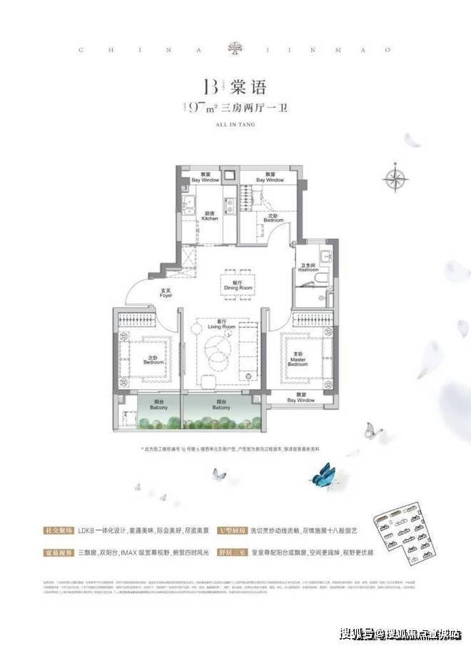 建面约97㎡3房2厅1卫,户型三开间朝南、再加上“3个飘窗+双面阳台系统”,不管是采光、视野、通风、私密性,还是实用性都十分出色。