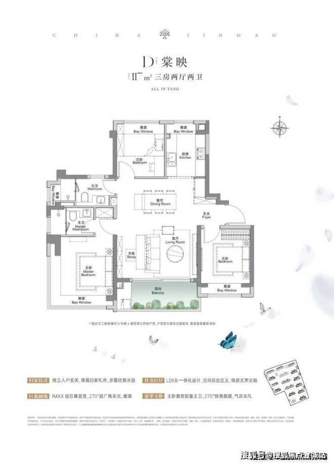 建面约105、117㎡3房2厅2卫,空间布局非常相似,都做到了三开间朝南+多个飘窗+主卧套房设计+270°转角飘窗。