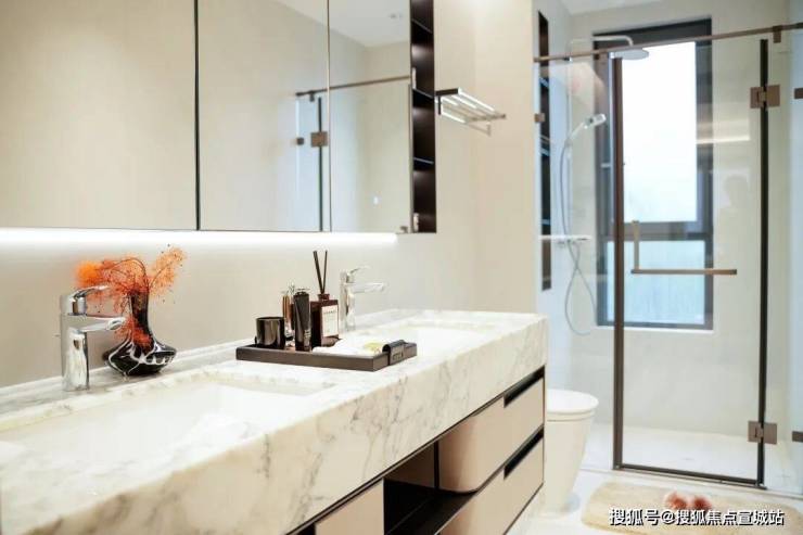 2个套房+2卧室,主卧采用了酒店化设计,步入式衣帽间,双台盆加浴缸,270°环幕飘窗,打造出整个奉贤“断层式”的奢居体验。