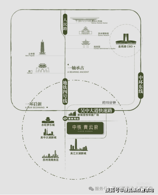 ◎发展之环:中环东接园区产经引擎,西融狮山创新脉络,南承太湖新城生态蓝图,北启高铁枢纽经济,便捷通达苏州多中心,启幕现代化城市发展新篇章。