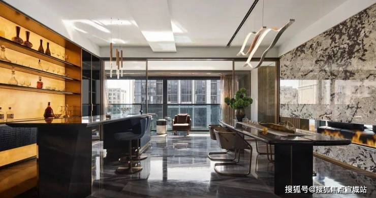品茗区蜿蜒精致的艺术吊灯,在茶室空间的上空以及金色光影的映衬下,更有了一丝空间的灵动感,座垫编织双厚度皮革杜兰戈结合金属一起,将整体空间的低调奢华隐隐呈现。