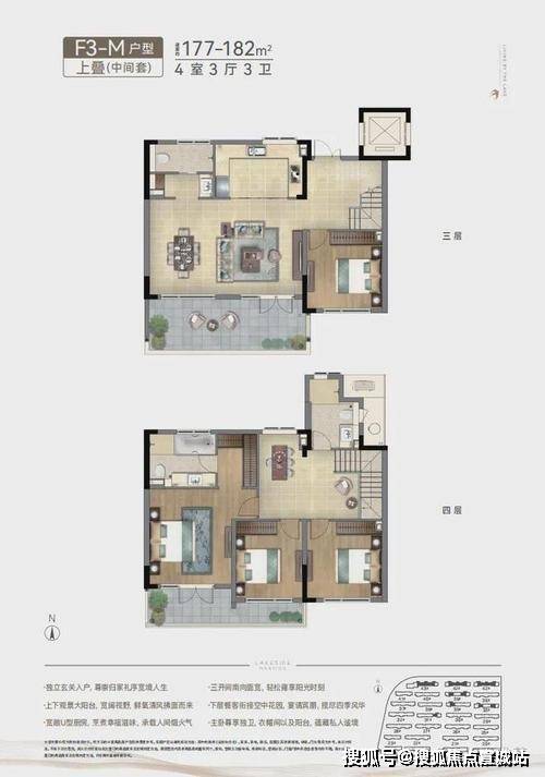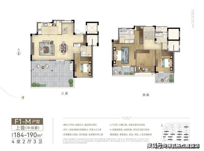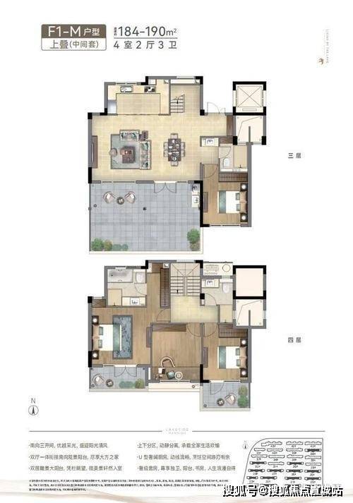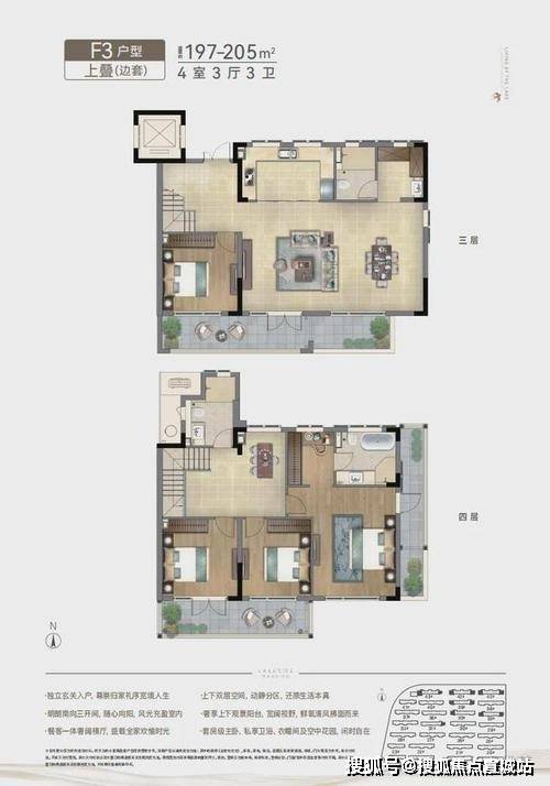 建筑面积约188㎡的上叠样板房,分三楼与四楼双层空间,整体采取了四房两厅三卫的设计,上下分区,实现生活场景的动静分离:餐客厅等社交娱乐空间均设在三层,四层则是卧室、书房等静谧空间,娱乐与休息互不干扰,为家人提供了更高品质的居住体验。