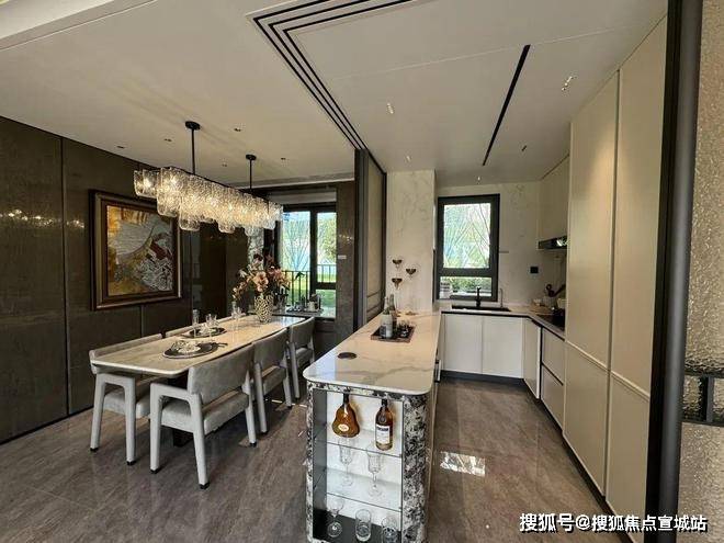 招商中旅·观境的解决方案是“零无效空间”。通过整合餐客厨等公共区域厅,将原来南北厅中间的走廊空间融合到使用空间中,减少过道的面积,避免碎片化的空间带来的冗余浪费。大面宽,短进深,餐厅与客厅横向相连,每一平方米都物尽其用,把客厅升级为家庭互动主场。