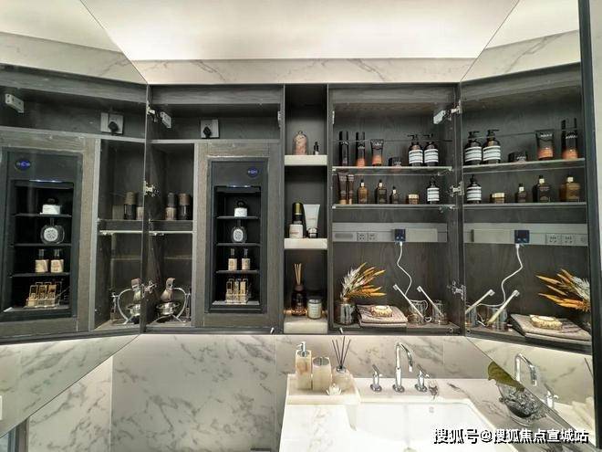 双卫配置,其中一个做了干湿分离,科勒台盆+双智能马桶,除雾镜柜均内置了牙刷消毒器、预留吹风机插座。主卫镜柜还有美妆冰箱,收纳空间相当充足。