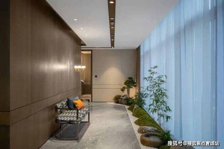 室内还有更精妙之处。潮上中南银座的每套房源,都设计了一条7米多长、3米宽的室内艺术廊道。加藤精心挑选棕竹、铁线蕨,规置手水钵、石灯笼和苔山。