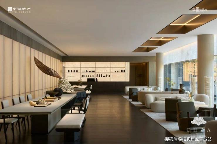这座水庭也是一整面「水镜」,将中心的乌桕树、周围的超大白玻、精致的艺术雕塑都倒映其中。
