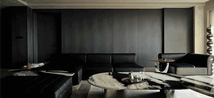 水墨风格暗沉色调的整体空间开场厚重,加一点丹色冉冉,随即点燃先抑后扬的场所氛围。