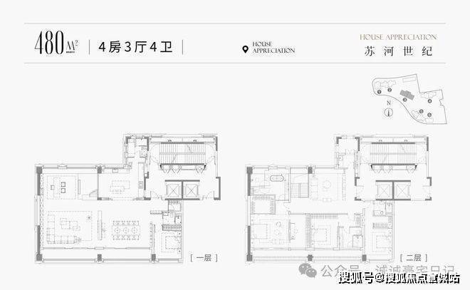 至尊复式:建面约 480㎡,5 室 3 厅 5 卫,双层挑高 + 专属空中花园,可俯瞰苏州河。
