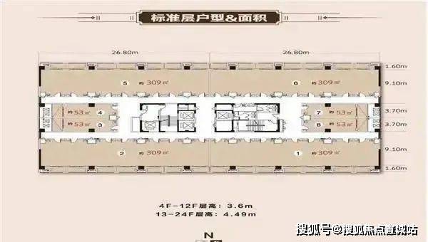 写字楼:位于 4 号楼,面积 53-617㎡,层高 4.49 米,单价 1.2-1.4 万 /㎡。