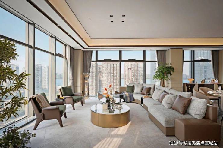 通过大面积落地窗,结合空中花园式的禅意景观,营造自然、灵动、大气、通透的空间尺度,揽江景入怀,为室内增添独特的设计符号。