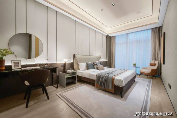 卧室的设计,采用高级的暖灰色调,深色原木为介质,塑造出沉稳的气质与空间的张力,更在视觉上丰富了景深。极具意蕴的装饰画与墙面装饰,共同营造出温馨舒适的居住氛围,简约的书桌前放置着一张皮质的扶手椅,让主人可以舒适惬意的度过午后时光。