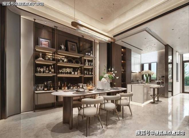 客餐厅采用一体化设计,通过石材、影木、皮革、金属、玻璃等不同材质在光影下的交织,形成张弛有度的现代轻奢多元的场景体验,内敛优雅,充盈着浓郁的都市质感。