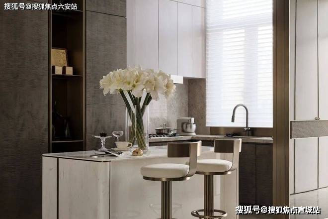 在日常生活中,厨房不仅仅是烹饪和食物准备的空间,还承载着情感的交流。开放式的餐厨空间设计可供家人朋友的聚会交流,以及展示男主人收藏的酒具和女主人喜欢的杯碟及艺术小画。