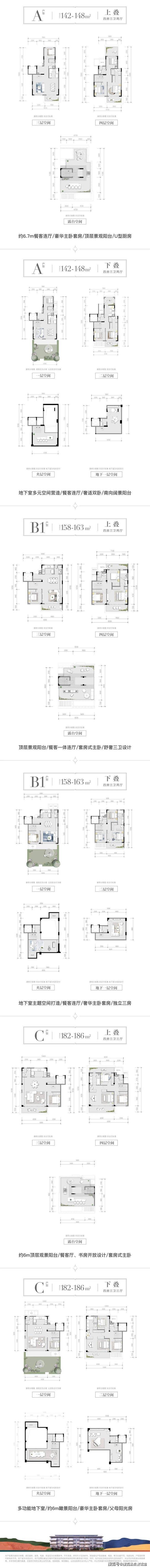 建面约 158-163㎡下叠:地下室主题空间打造、餐客连厅、奢华主卧套房、独立三房。