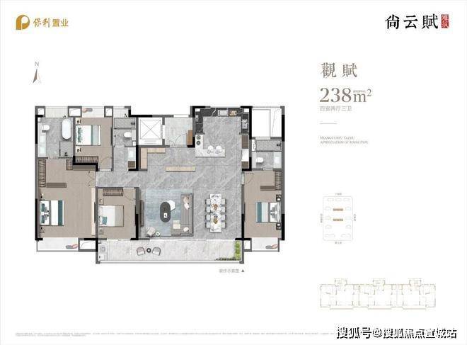 建面约238㎡户型,在布局和设计上,更是再做了升级设计,单景观面就有近20米!正南阳光,一年四季,都肆意在家中游走,这才是真正的尺度。