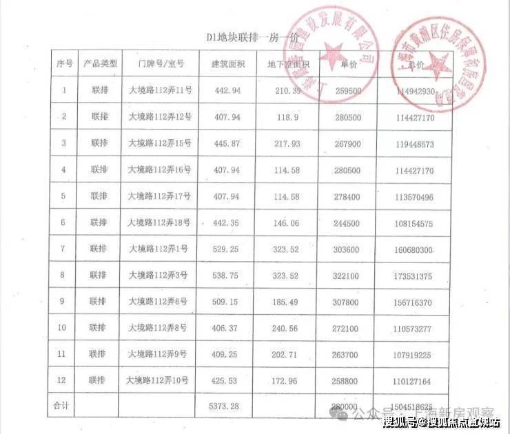 一房一价表如下