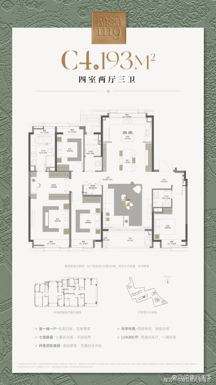 193㎡四房:设有双主卧,全屋飘窗赠送面积达20.7㎡(含主卫),尺度媲美别墅。配备英式管家服务,电梯厅可直达户内,并采用嘉格纳厨电、德国美诺洗衣套装,尽显奢华品质。