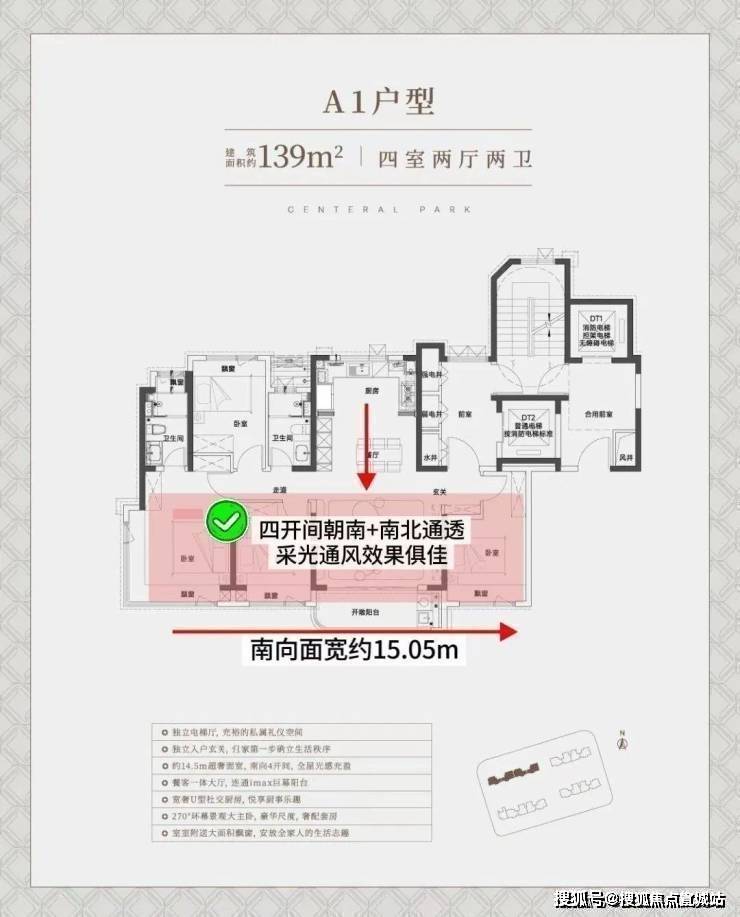 深,约15.05m的南向奢阔面宽, 无论是采光感、尺度性都拉到了极致,享受城央豪宅级别的采光。