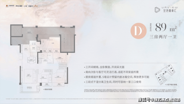 首先,是建面约89㎡三房两厅一卫(D户型),不仅功能完备,而且很好地把控了总价,约350万起即可上车高配品质三房,堪比市场上110平左右的空间感!