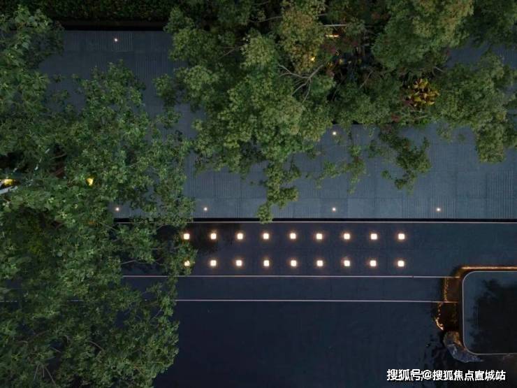 城市的喧嚣在这一隅园林中被沉淀,天色低垂,一池澄澈水面映衬着水乡的灯火通明,设计将夜幕中的灯火点缀在景池中,如江南繁华初绽,繁星摇曳。