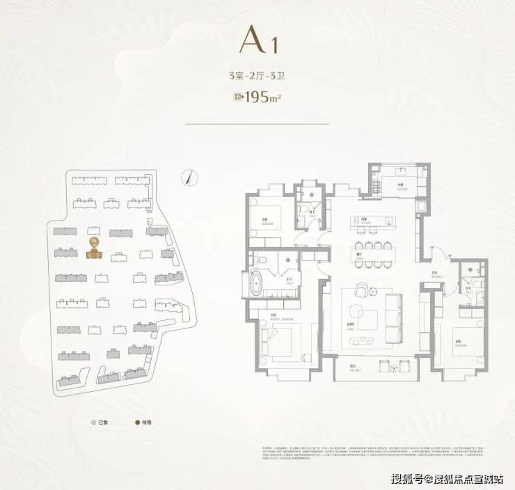 建面约195㎡3房是天安1号首次入市的产品,也是整个项目最高舒适度的产品。它位于社区的中央,楼下就是中央景观轴,视野、采光都相当出众。超大尺度感的客餐厅,东西双厨的设计,更符合当代城市菁英的需求。三套房的设计,每一个卧室都是普通豪宅主卧的尺度感和标准。没有短板的户型,真正的顶奢产品。